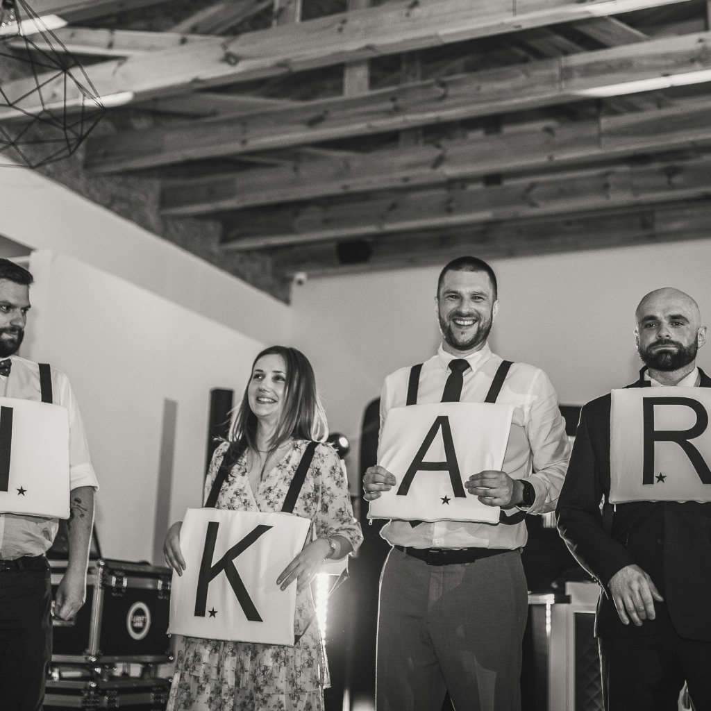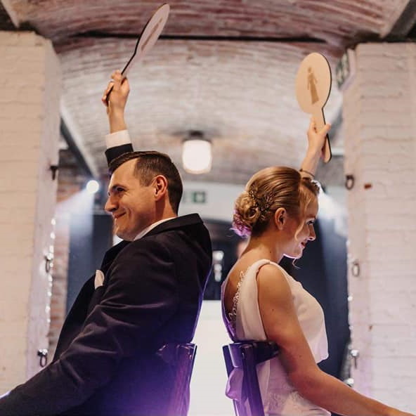 Zabawe tę przeprowadzam jako wprowadzenie do oczepin na wzór programu ,,Milionerzy". Para Młoda siedzi na krzesłach tyłem do siebie i odpowiada na pytania prowadzącego tylko i wyłącznie za pomocą drewnianych tabliczek na których są wypalone wizerunki Pani Młodej i Pana Młodego.