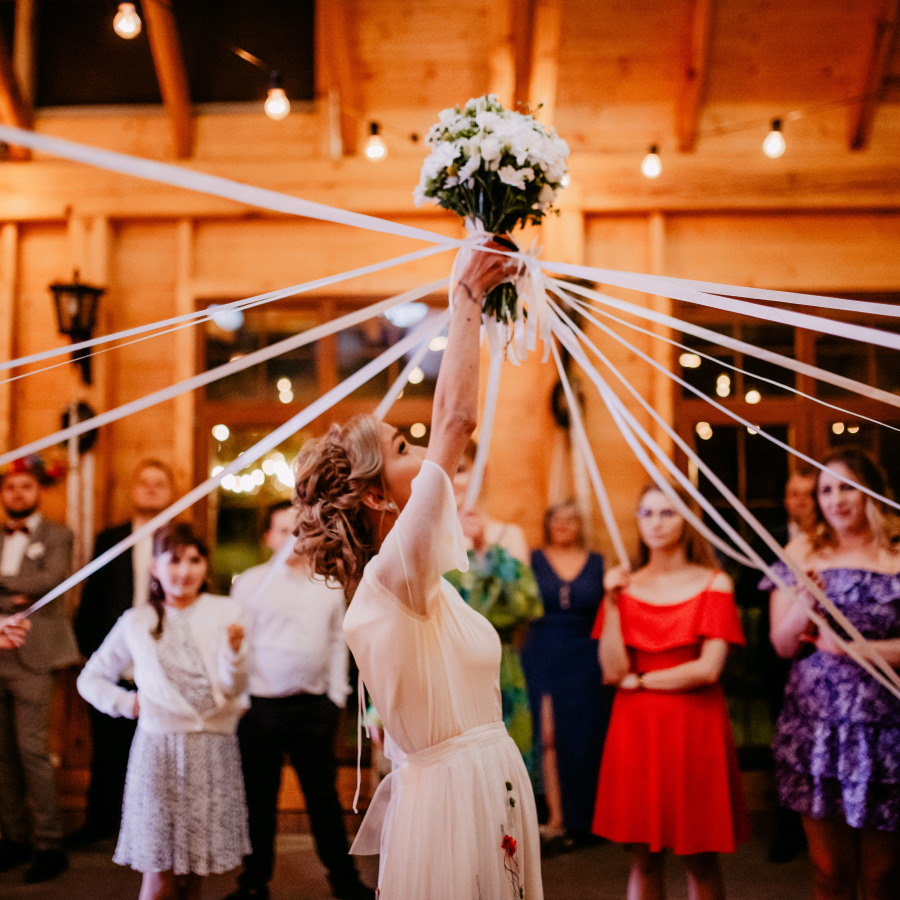 Bukiet i wstążki - Zabawa ta polega na stworzeniu kółka dokoła Pani Młodej przez wszystkie panny biorące udział w weselu. Następnie przecina ona wstążki w dowolnej kolejności, a ostatnia, która zostanie do przecięcia jest tą wybraną.
